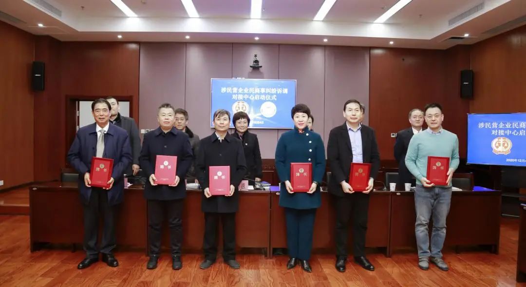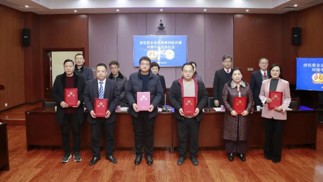 随后,王波院长、武晓红副部长共同为“涉民营企业民商事纠纷诉调对接中心”揭牌。揭牌仪式上还宣读了聘任50名同志为“涉民营企业民商事纠纷诉调对接中心”调解员的决定,现场为调解员代表颁发聘书。