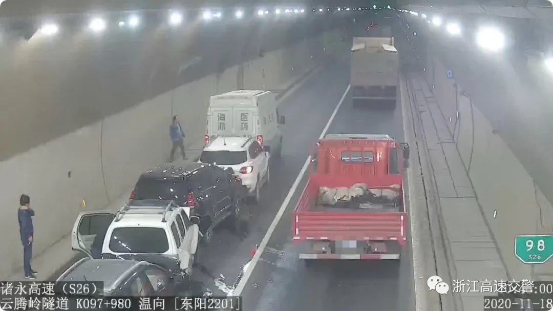 11月18日10时26分,s26诸永高速温州方向98公里云腾岭隧道内发生一起5车追尾事故……接报警后高速交警金华支队执勤民警立即赶赴现场。到达现场后,多名司乘人员反映,该起事故是因前面一辆浙G牌照的轻型货车突然在隧道内第一车道上停车所导致。