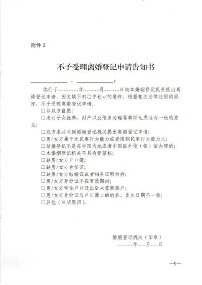 婚姻登记员对当事人提交的证件和证明材料初审无误后,发给《离婚登记申请受理回执单》(附件2)。不符合离婚登记申请条件的,不予受理。当事人要求出具《不予受理离婚登记申请告知书》(附件3)的,应当出具。