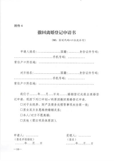 (三)冷静期。自婚姻登记机关收到离婚登记申请并向当事人发放《离婚登记申请受理回执单)》之日起三十日内,任何一方不愿意离婚的,可以持本人有效身份证件和《离婚登记申请受理回执单》(遗失的可不提供,但需书面说明情况),向受理离婚登记申请的婚姻登记机关撤回离婚登记申请,并亲自填写《撤回离婚登记申请书》(附件4)。经婚姻登记机关核实无误后,发给《撤回离婚登记申请确认单》(附件5),并将《离婚登记申请书》、《撤回离婚登记申请书》与《撤回离婚登记申请确认单(存根联)》一并存档。