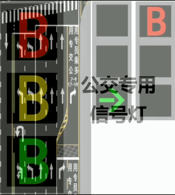 1.公交专用信号灯:公交专用车道同步启用公交专用信号灯,发光单元为“B”(取英文Bus首字母),公交车及准许借道行驶的车辆,应在路口上游停止线前(黄色禁停网格线)停车等候,按公交专用信号灯指示通行。