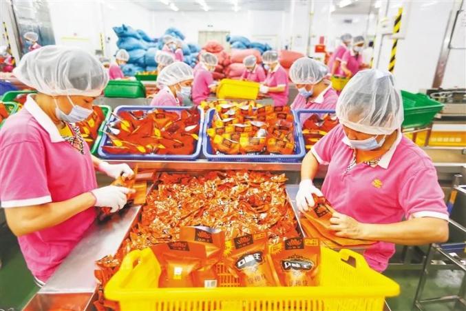 位于万宁的海南口味王科技发展有限公司的生产车间,工人正在忙碌。1