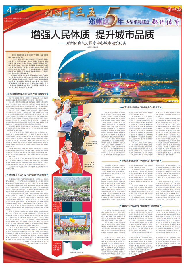 体育使城市充满活力,城市因体育勃发生机。“十三五”期间,郑州多领域齐头并进带动体育产业升级,以赛事促群众体育消费增长,融合文化、旅游因地制宜发展,体育产业发展的“郑州模式”成果显著。