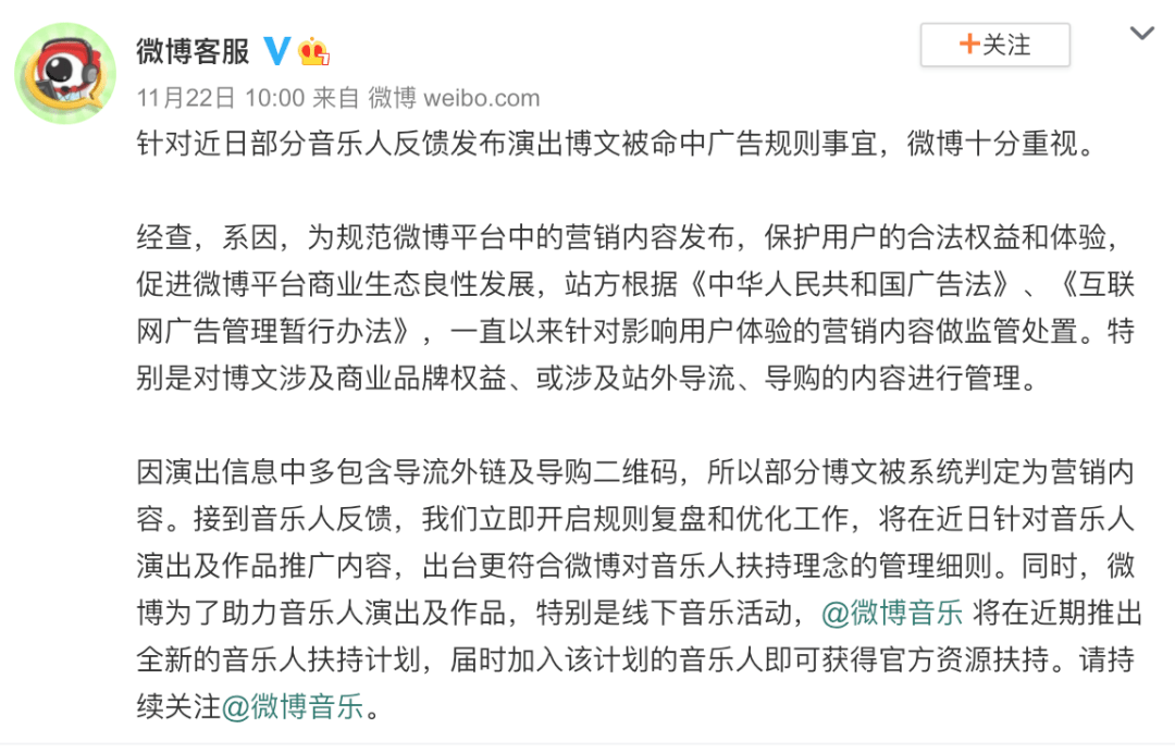 微博方面称因为博文中带有外部链接和导购二维码,所以被系统误判为营销内容,目前已经在逐步恢复这些微博。微博还表示,近期将会推出全新音乐人扶持计划,“为音乐人保驾护航尽微博之力。”