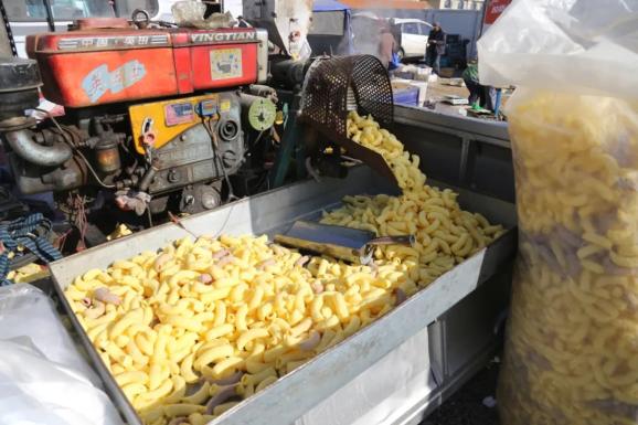这不是小时候经常吃的玉米棍吗,类似拖拉机车头似的机器“突突”作响,热乎乎的玉米棍不断地从机器中“流”出。5块钱一大袋,买回去的玉米棍,满满的都是回忆呀!