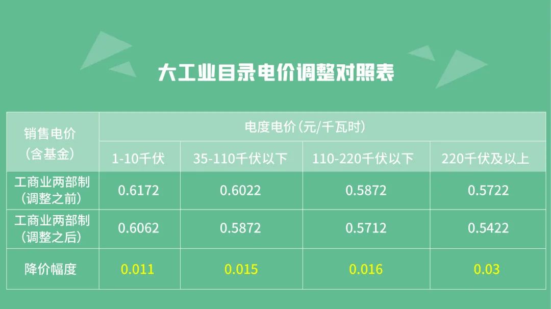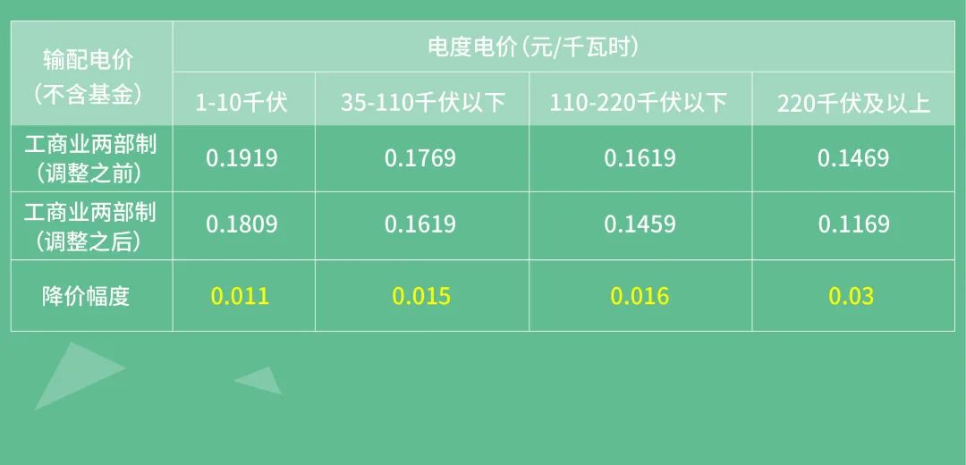 自2021年1月1日起,执行两部制电价的工商业及其他用电的客户,电压等级1-10千伏,每千瓦时降低1.1分;35-110千伏以下,每千瓦时降低1.5分;110-220千伏以下,每千瓦时降低1.6分;220千伏及以上,每千瓦时降低3分。