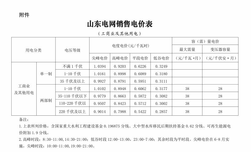 自2021年1月1日起,降低山东电网工商业及其他用电(两部制)销售电价和输配电价,并对峰谷分时电价时段进行了优化。