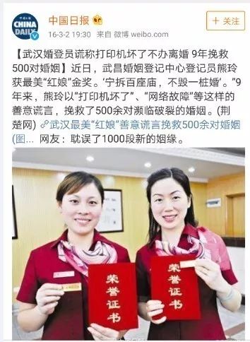 与济南法院的离婚冷静期“齐名”的,还有2016年武汉的最美“红娘”金奖获得者,号称用“打印机坏了”“网络故障”等奇妙谎言,9年里“挽救”了500对婚姻的武昌婚姻登记员。