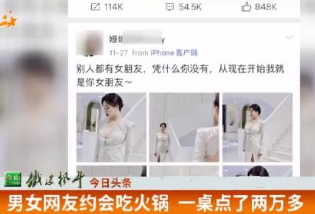 原标题:《男女网友约会吃火锅花了2万多元!女子:他摸我胸,还逃单》