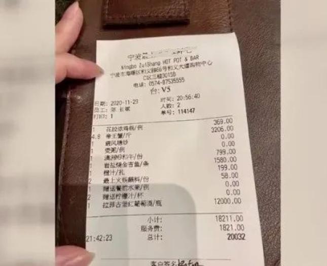 当天晚上两人定了一个包厢用餐,杨女士说这顿火锅菜钱大概是6000多,还有一瓶红酒,价格是12000,她觉得这个消费并不算特别高。