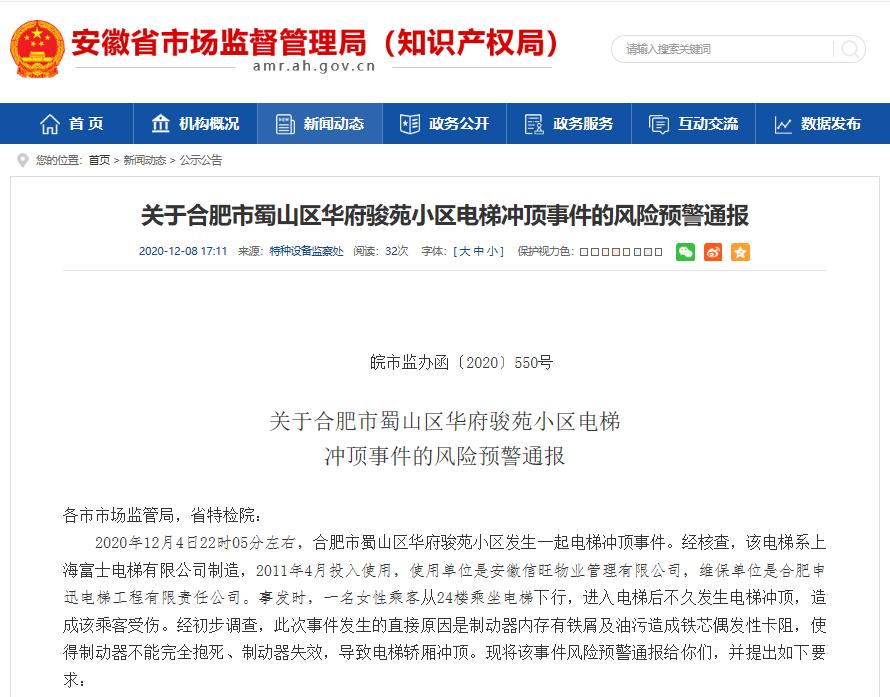 安徽省市场监管局要求,各市局应立即将此通报传达至各检验机构,电梯生产、使用、维保单位。