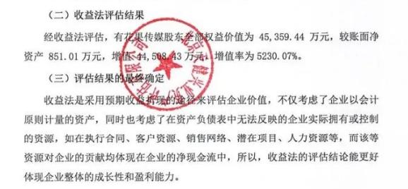 根据北京天健兴业资产评估出具的评估报告,按照收益法评估,有花果传媒股东全部权益价值为4.54亿元,增值率高达5260.07%。