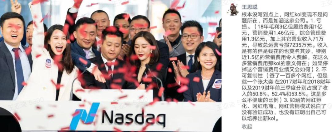 资本的热情似乎足以证明MCN是一门好生意,但硬币的另一面是,曾经蹭MCN概念炒作股价的公司早已跌落云端,不久前,头顶“网红第一股”的如涵宣布退市,市场盛满张大奕征服不了华尔街的质疑。