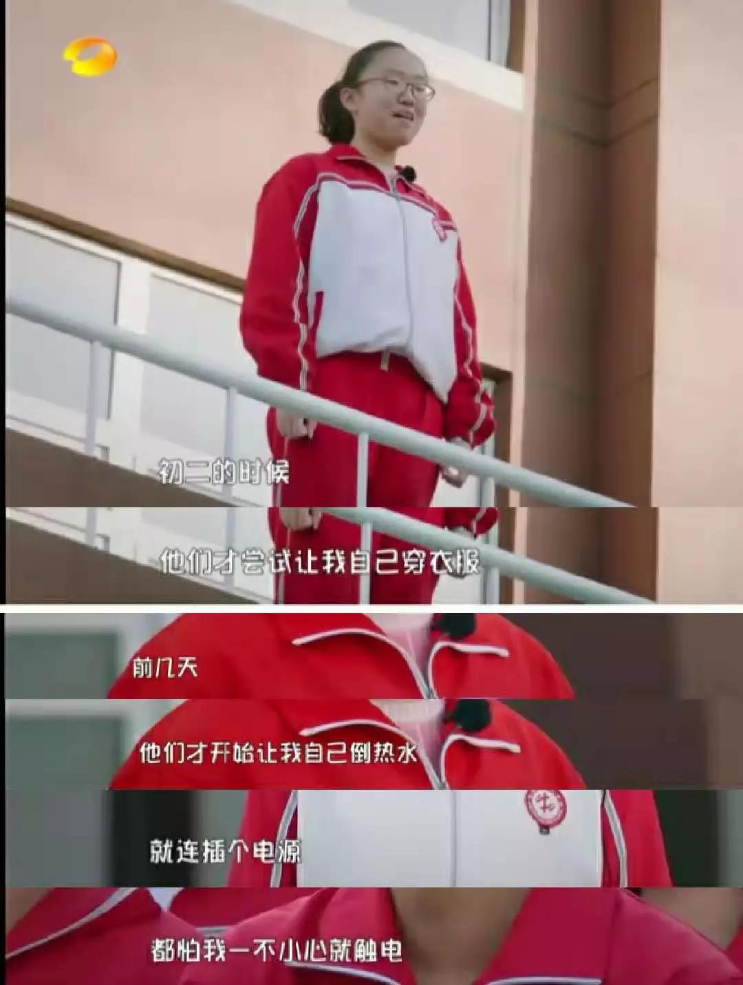 初二时,她才开始自己穿衣服;录节目前几天,她第一次试着自己倒热水;想要自己买衣服,却连衣服型号是什么都毫无概念。