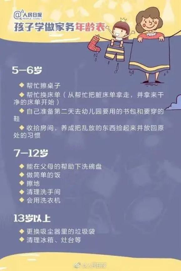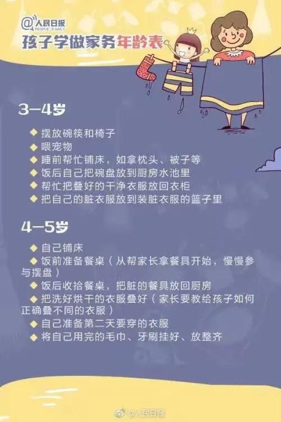 这里有一张关于孩子什么年龄适合做什么家务的表格,可以供父母们参考: