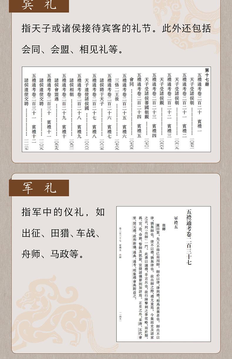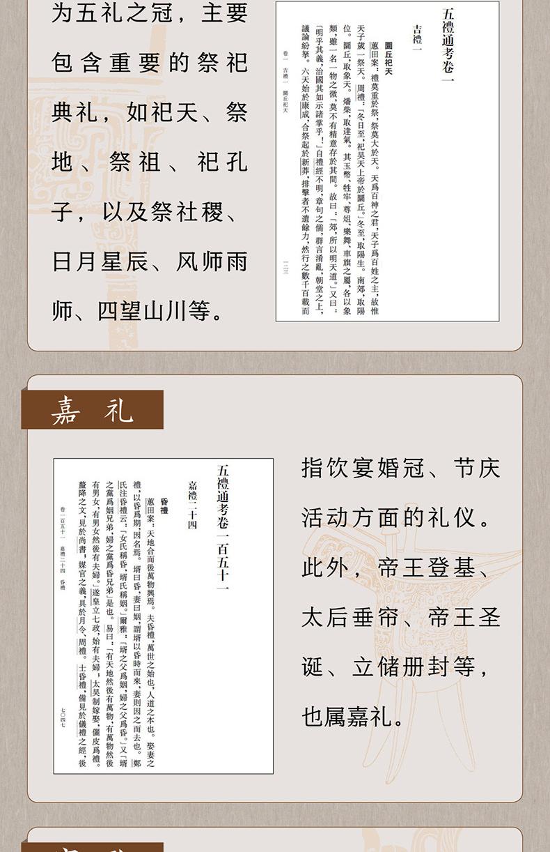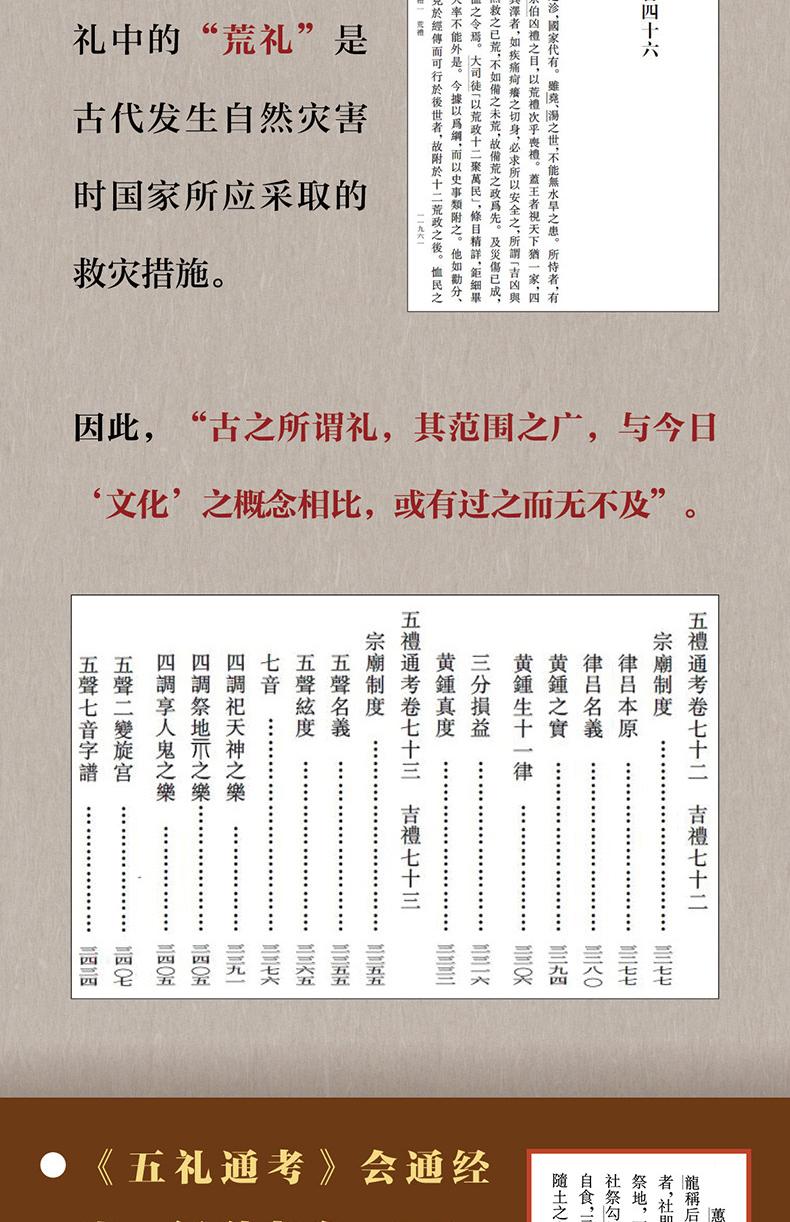 中国古代的礼,所包含的内容不只是礼仪制度,其实质相当于现今的“文化”,甚至比文化涉及的范围更广。如《五礼通考》中的“学礼”是教育制度,“观象授时”是天文历法,“体国经野”是地理,“设官分职”是职官制度,“军制”是古代军事制度,“荒礼”是古代发生自然灾害时国家所应采取的救灾措施。这些内容在本书中都有详细的考证。