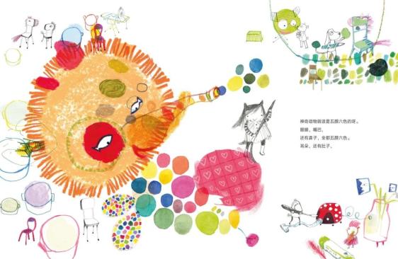 先画两只眼睛、一张嘴,再画鼻子和耳朵……出了点意外,因为还没来得及涂色,神奇动物走丢了。还好小女孩找到了它,开始给它涂颜色……