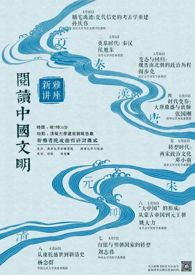 《新雅中国史八讲》脱胎于清华大学新雅书院一门3学分的本科生通识课。这门名为“阅读中国文明”的课程由两部分组成,一部分是学生的阅读、写作、讨论,另一部分则是八次中国史的专家讲座(即本书的八讲)。说来有趣,正式选修此课亦即需要投入大量时间阅读、写作、讨论的同学只有一个小班,但每次讲座的受惠者则是多达数百人的听众。至今仍记得2018年4月至6月,每周四晚上清华大学可容600人的最大讲堂人满为患的情景,堪称清华园的一道风景。