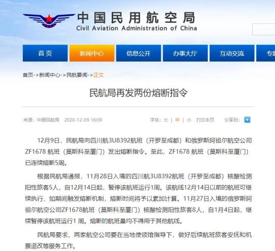 12月9日,民航局向四川航3U8392航班(开罗至成都)和俄罗斯阿祖尔航空公司ZF1678 航班(莫斯科至厦门)发出熔断指令。至此,ZF1678 航班(莫斯科至厦门)已连续熔断5周。根据民航局通报,11月28日入境的四川航3U8392航班(开罗至成都)核酸检测阳性旅客5人,自12月14日起,暂停该航班运行1周。该航线12月14日以前的航班可继续执行,如期间触发熔断机制,熔断时间将予以累加计算。11月27日入境的俄罗斯阿祖尔航空公司ZF1678航班(莫斯科至厦门)核酸检测阳性旅客8人,自1月4日起,继续暂停该航班运行1周。熔断的航班量均不得用于其他航线。