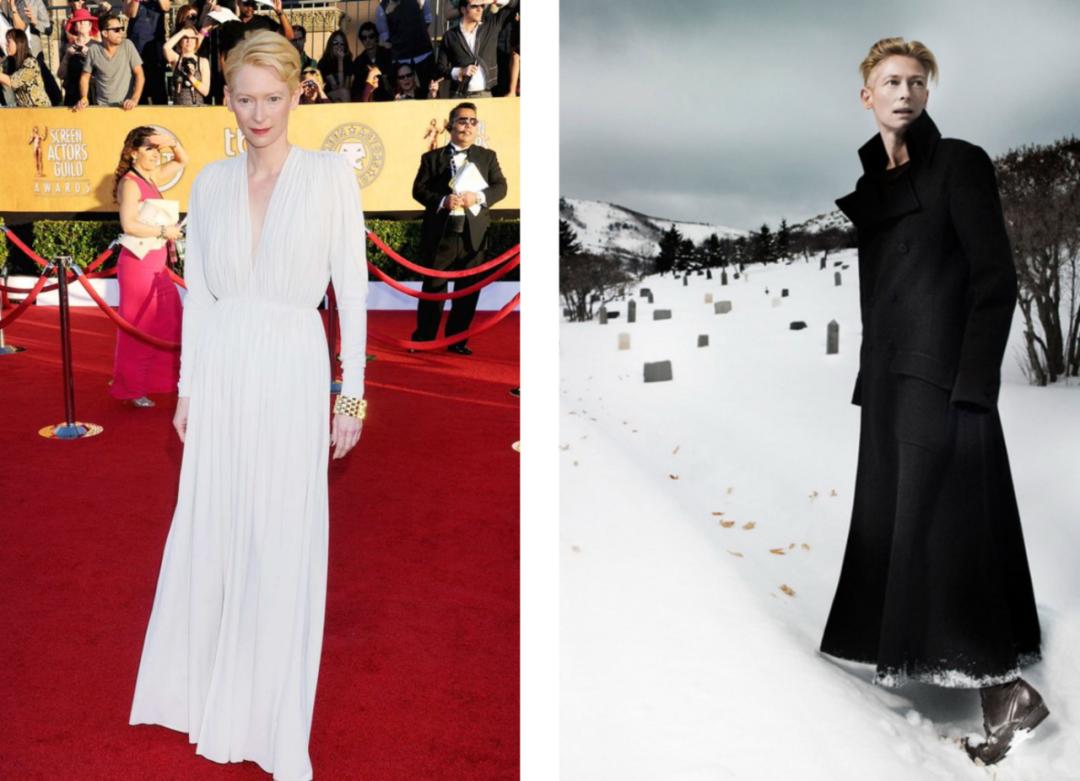 ▲女演员蒂尔达·斯文顿,大家应该挺熟悉的了,在演员方面,她是剧抛形象;演员之外,她的形象也常常让人雌雄莫辨。