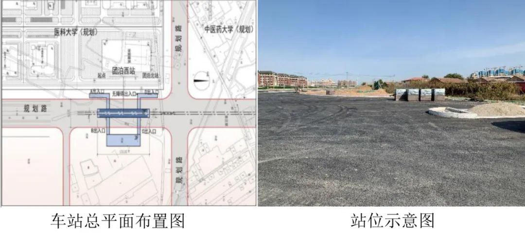 国际医学城站(原规划团泊西站):拟定位于医科大学及中医药大学附近,本站为高架两层单柱2*5m侧式站台车站,地上一层为地面层,地上二层为站台层。东侧有一座三层附属用房。