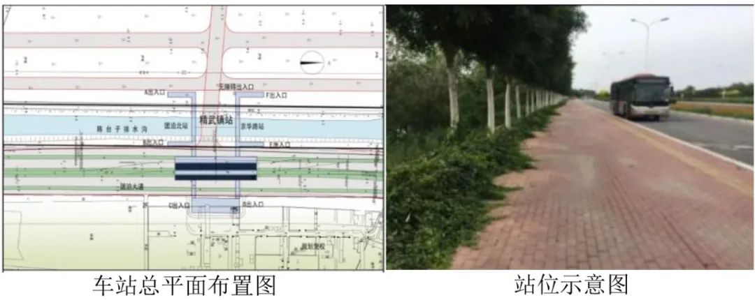 精武镇站:拟定位于团泊大道沿线,本站为高架三层双岛一侧站台车站,地上一层为首层,地上二层为站厅层,地上三层为站台层。其中车站B1、B2出入口与附属用房合建,C出入口与变电所附属建筑合建。