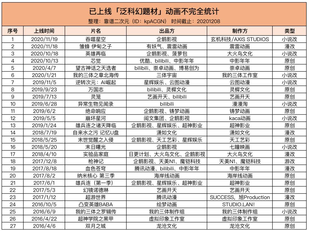 过去5年27部科幻动画已上线,部分制作团队已阵亡虽然今年泛科幻题材动画扎堆,但从国产网络动画快速发展的近五年来看,科幻动画并不是稀有题材。靠谱二次元(ID:kpACGN)整理了过去5年上线的27部泛科幻动画,其中虽然硬科幻作品并不多,但多数都取得了不错的口碑,有不少核心粉丝。另外的作品以科幻元素为主,结合都市、奇幻、搞笑等要素,普遍表现中规中矩。还有部分国产动画作品以其他题材为主,部分篇章科幻元素较多,并不在我们本次的统计范围内。