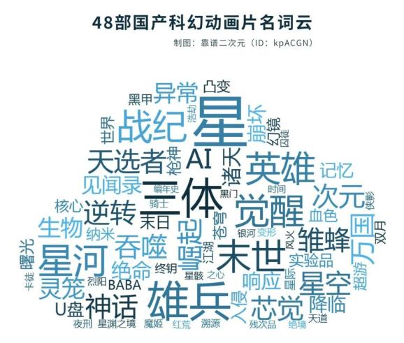 比如,靠谱二次元(ID:kpACGN)整理了上述48部作品名生成了词云,可以看出目前国产科幻动画仅从名字上看就同质化非常严重,“星x”、“战纪”、“x雄”这些都是起名时特别高频出现的词汇,其他一些比如天地、苍穹、末世、世界、觉醒、崛起等等也都是比较俗套的起名方式,随便把词语打乱顺序重组,贴在原片上改个名,也毫无违和感。当然,比名字同质化更可怕的,是作品画面风格、故事内容、甚至角色设定的同质化。目前国内科幻动画3D居多,当然这也与海外影视公司运用3D制作出顶级科幻作品有关。但国内动画公司目前只效仿到了3D这一步,具体到画面与成功作品仍有较大差距。每部作品在美术设定、模型制作、光感、特效上都非常相似,特别容易“脸盲”。相比之下国产动画古风玄幻品类每家公司的风格化就很强,擅长点和特色明显,经常看动画的观众一看就知道制作公司是哪家,进而形成了品牌效应。