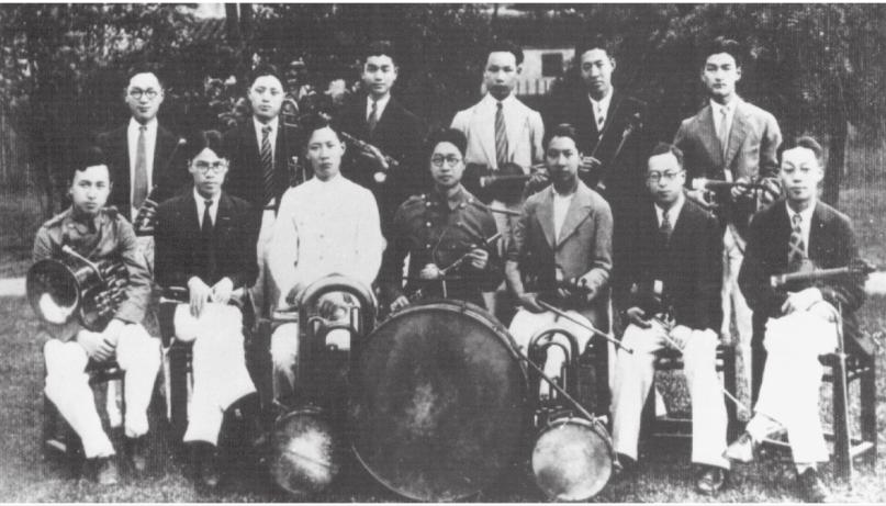 钱学森(前左一)在交大铜管乐队合影