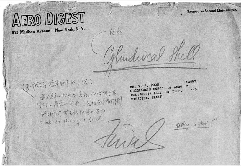1941年,钱学森在美国《航空科学学报》发表科研成果《柱壳轴压屈曲》一文,攻克了困扰航空界多年的难题。这篇文章仅有寥寥10页,极为简明,而钱学森在研究过程中仅编有页码的推导演算手稿就达800多页,其中有些计算数字精确到了小数点后8位。论文完成后,钱学森把手稿存放到纸袋里,并在纸袋外面写下了“Final”(定稿)字样。但他立刻想到,科学家对真理的探索永无止境。于是,他又写上“Nothing is final”(永无止境)。