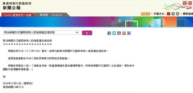特区政府发言人表示,这项措施是配合中央人民政府对美方采取的反制措施。措施生效后,除直接过境及留在机场禁区内,所有持美国外交护照人士访港前,须先向中国驻外使领馆申请签证。