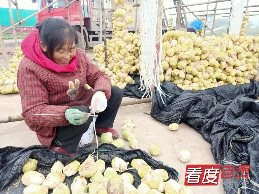 在现场记者看到,村里的自然香大头菜加工厂一片忙碌,附近不少村民正在帮着企业晾晒大头菜。村民谢和英这些天就在厂子里干临时工,她说镇上大力发展大头菜产业,让她每年都能在厂里找钱,现在每天能够挣七八十元钱,增收很稳定,心里很高兴。