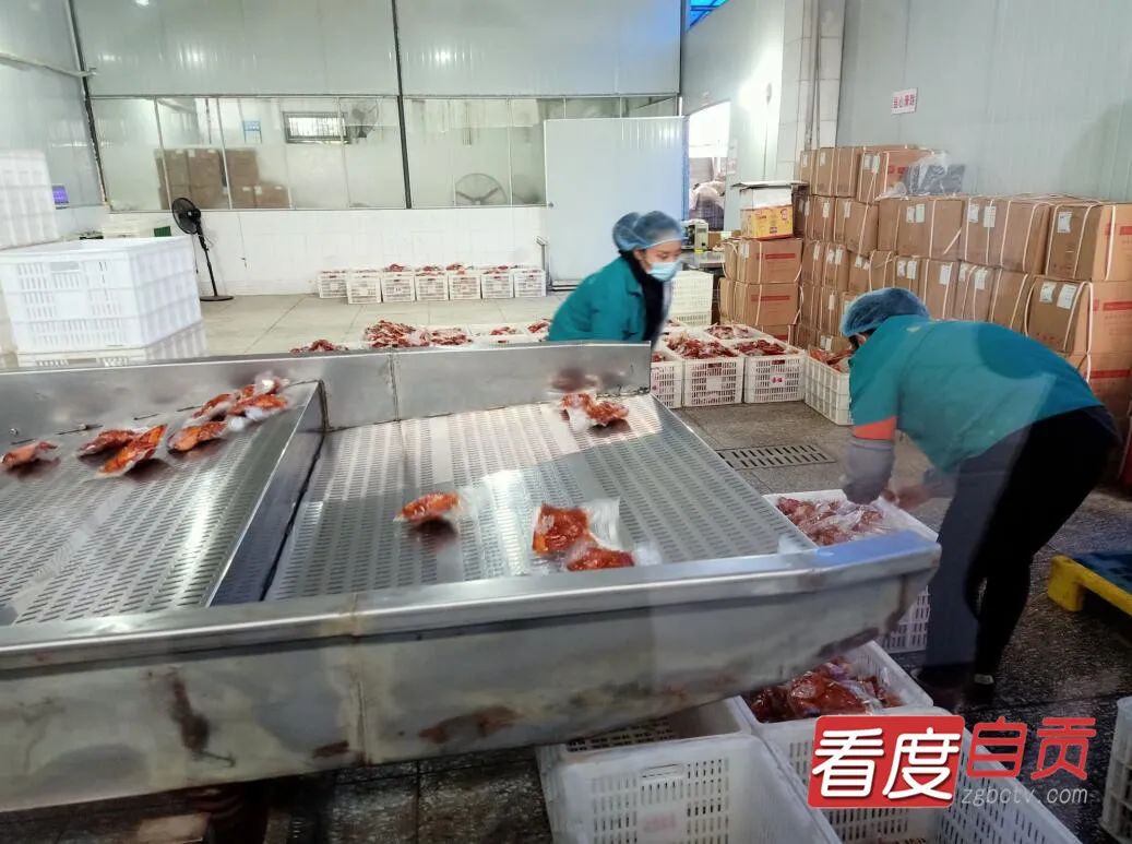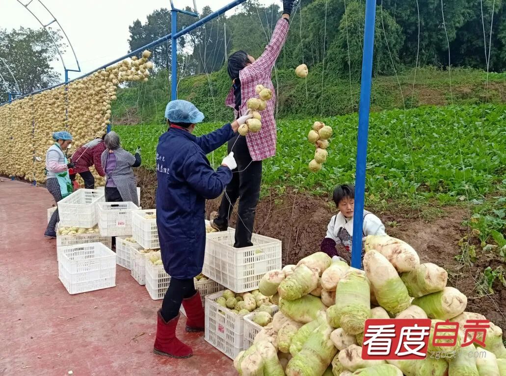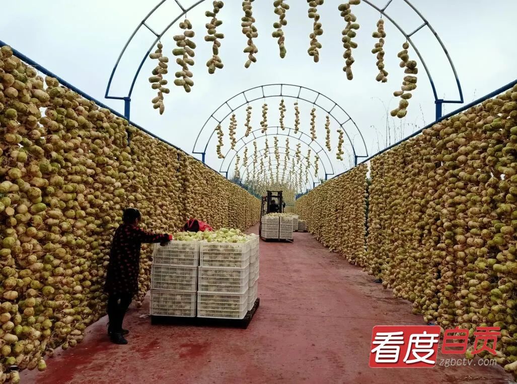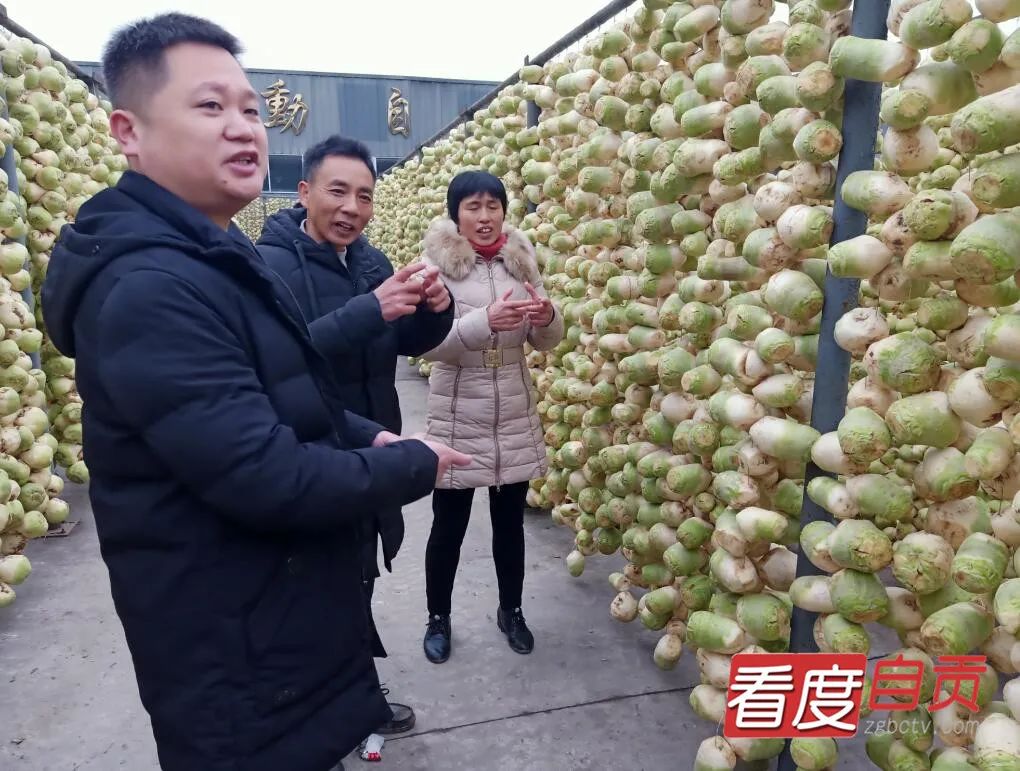 长廊的一头和坐落在村里的省级农业龙头企业自贡市泰福农副产品加工厂有机相连,长廊里企业的工人忙碌不停,一边取下晾晒好的大头菜,一边又把刚刚清洗的大头菜悬挂上架。