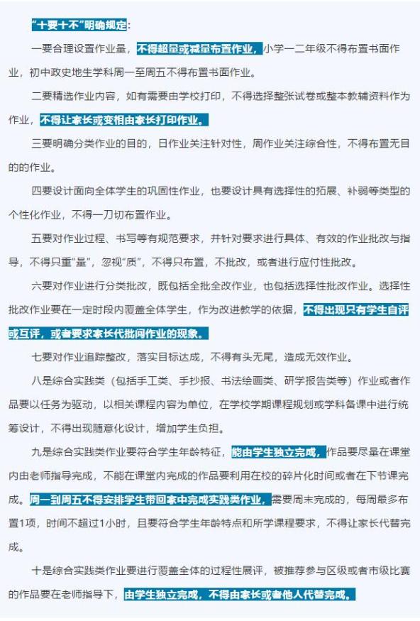 为减轻中小学生作业负担、减轻家长负担,山东省潍坊市高新区教育局出台《潍坊高新区学生作业规范“十要十不”》,其中明确: