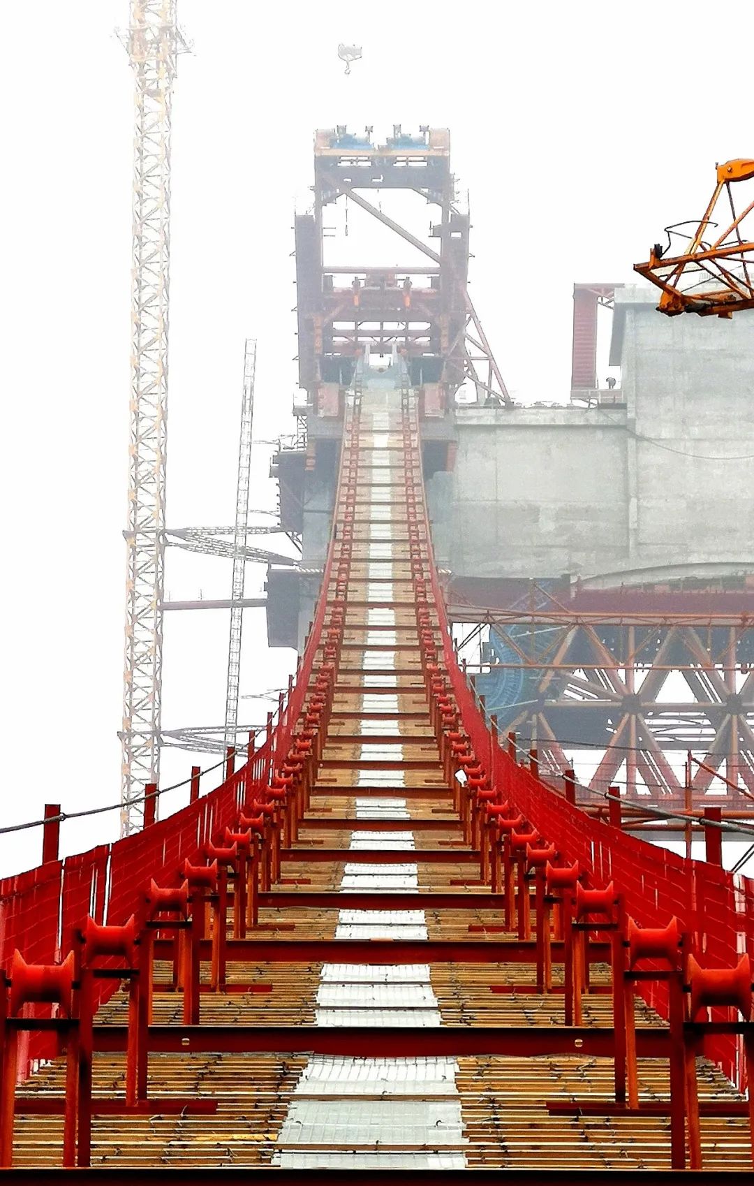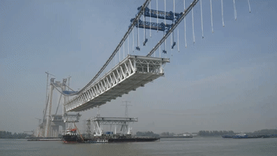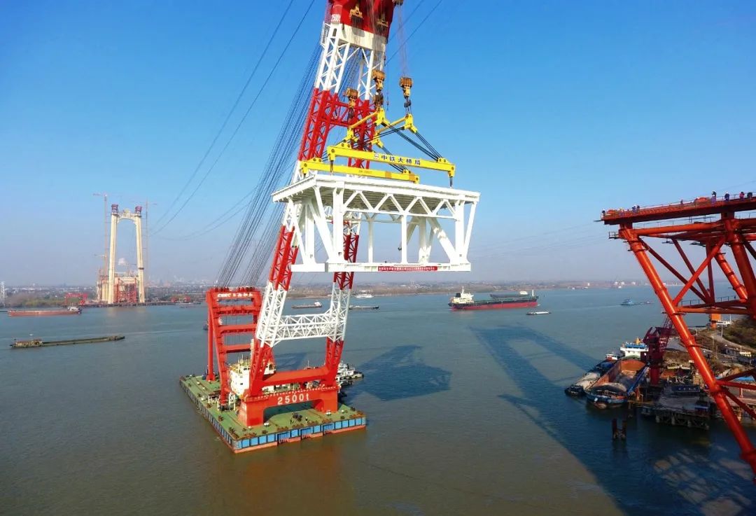 为满足钢梁架设需求,中国中铁大桥局首次研发了900吨超大吊重缆载吊机,它是目前国内同类型设备中吨位最大、技术含量最高的缆载起重机。这样的大型装备,五峰山大桥用到了4台。