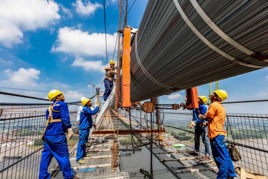 ——主缆施工中,建设者白天牵索、夜晚调索,并通过改进工艺及装备,将主缆索股的牵引架设,以平均每天7根的速度快速推进,创下了日安装索股19根的施工纪录。