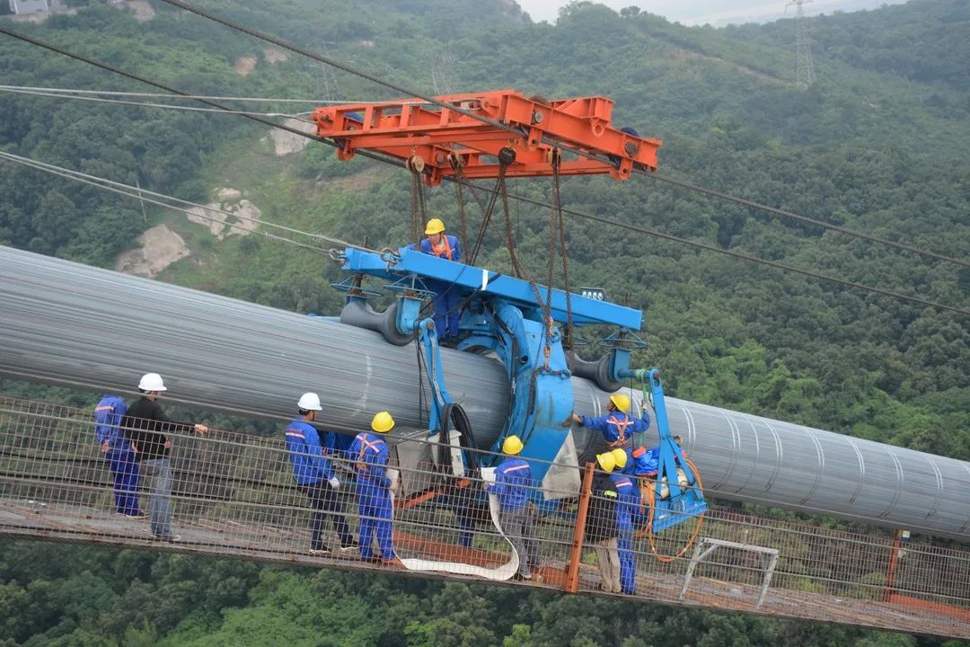 由于大桥主缆外观直径比以往悬索桥主缆直径大得多,没有现成紧缆机可使用。施工团队对此研发了专用紧缆设备——ZLJ1300型紧缆机,满足了直径1.3米主缆的紧缆需求。