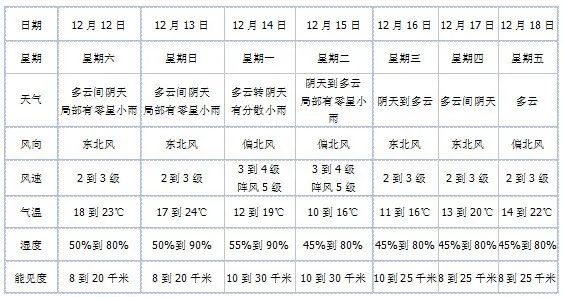 预计12-13日,鹤山市多云间阴天为主,气温继续略升,局部偶有零星小雨;14至16日受冷空气影响,北风加大,初时伴有分散小雨,气温明显下降,体感阴冷;展望17日起气温回升。