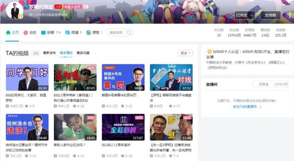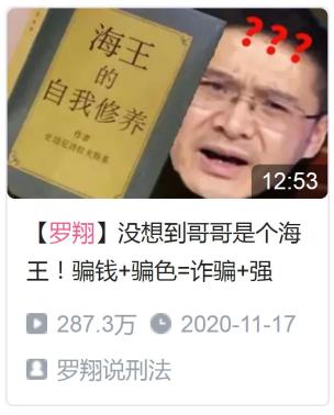 《罗翔说刑法》作为罗翔的代表作之一,被网友们冠以“狂徒张三的书剑恩仇录”,备受年轻人追捧,粉丝数从0到100w只用了两天,被誉为“B站2020最速百万粉传说”,之后,半年涨粉破千万。