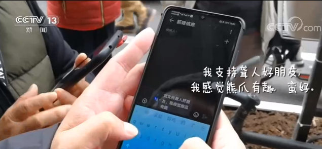 △听障者和记者用手机打字交流:我支持聋人好朋友,我感觉熊爪有趣,蛮好。