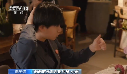 莉莉时光咖啡馆店主 章莉莉:我也希望在店里更多的是让更多的人了解这个群体,手语非常美,你看这个“爱”(手语),我爱你的话一定是觉得你很棒,然后爱是有触摸的,当他触摸的时候,他们就会有爱的流动,哪怕只是一个眼神,那也是一种交流。