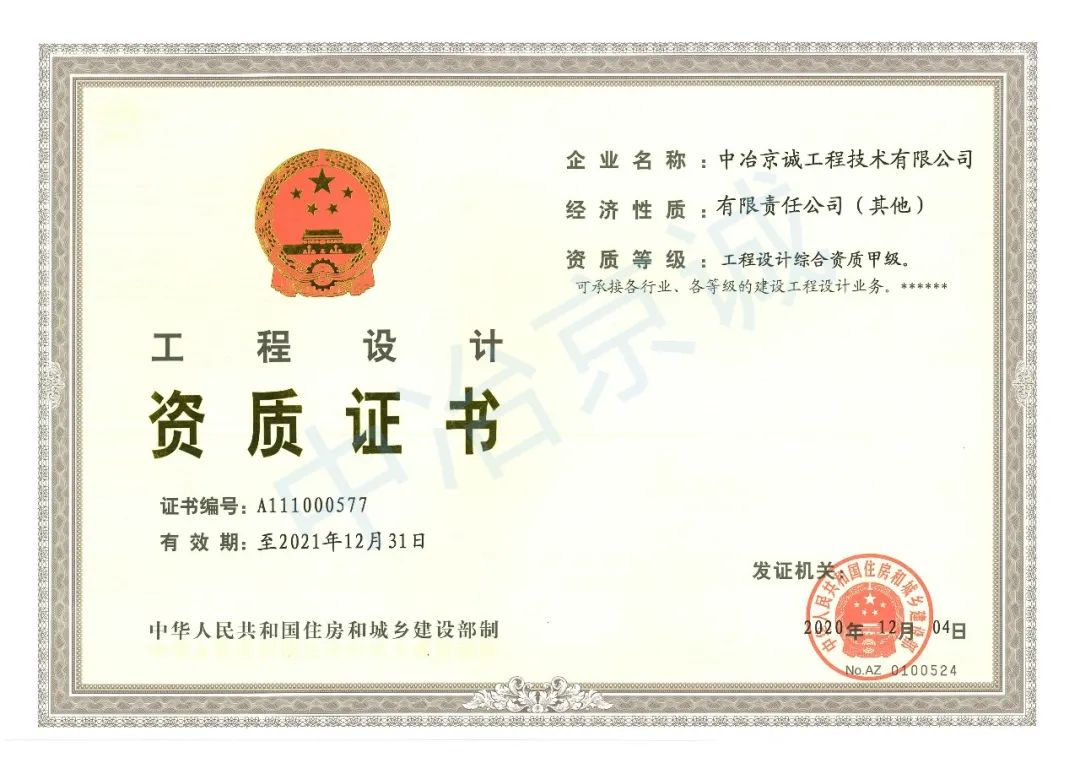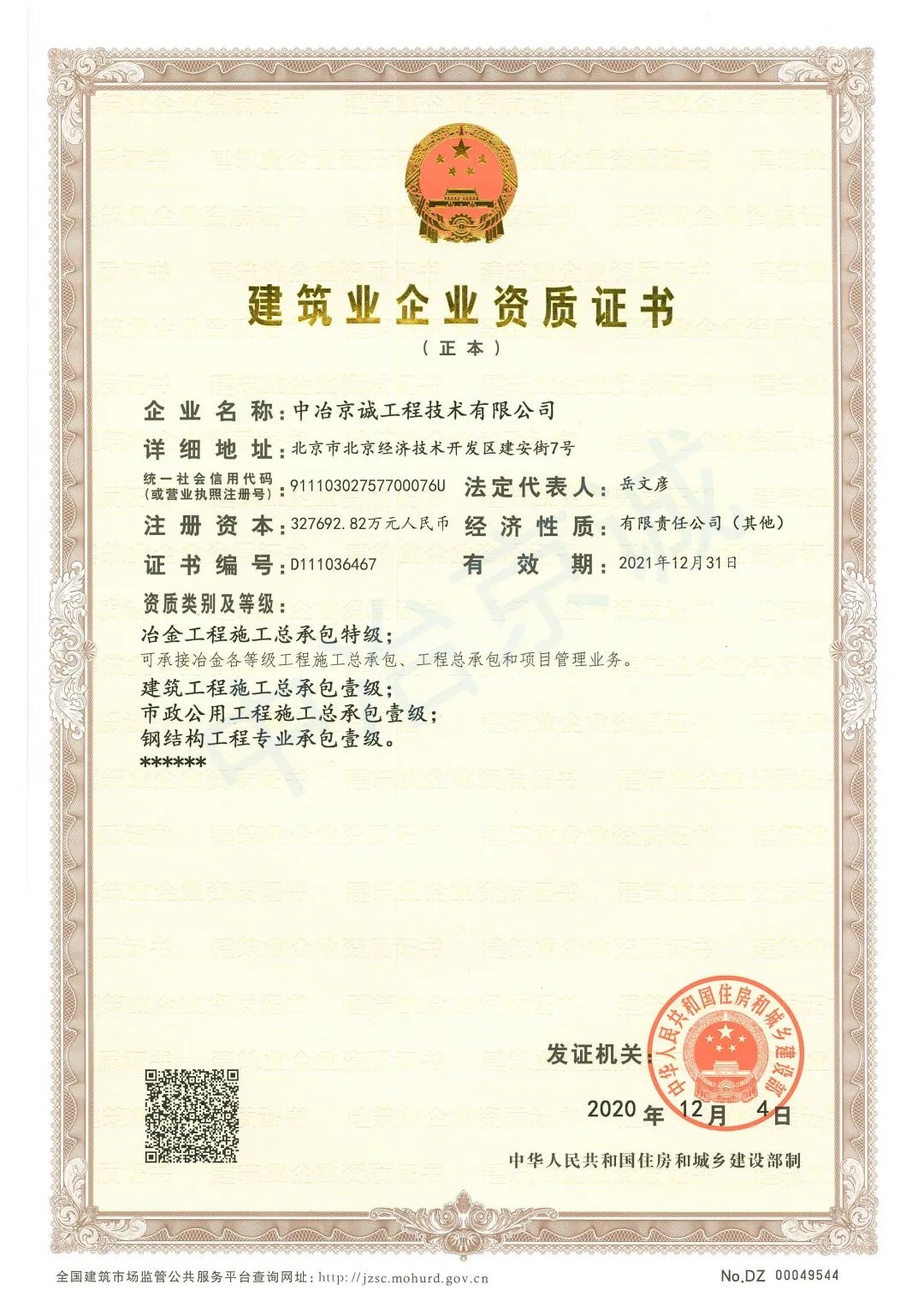 特级资质是国家住建部核定的我国建筑施工企业最高资质,也是衡量企业施工总承包管理整体实力的重要指标。2020年5月,随着国家压减资质等级、放宽市场准入政策的开启,为中冶京诚问鼎施工顶级资质提供了政策机遇。公司第一时间响应中冶集团关于资质专项工作的总体部署,在短短六个月时间里取得圆满成功,这也为集团的专项工作取得了开门红!除“三综一特”资质外,中冶京诚还拥有工程勘察、工程造价及建筑、市政施工总承包等多项国家高级别市场准入认可,构建了强有力支撑公司业务发展的综合资质体系。
