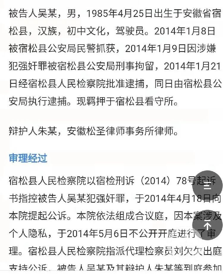 中国裁判文书网显示,2014年5月8日宿松县法院判决,吴某犯强奸罪,判处有期徒刑5年。2018年4月17日,吴某因“有悔改表现”获减刑8个月,刑期至2018年5月7日。