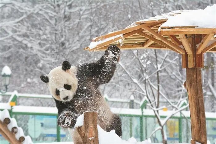 亚布力熊猫馆的熊猫佑佑在雪中嬉戏