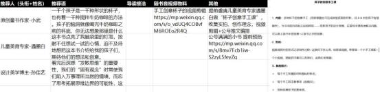 这个过程会更加理解(吃透)这本书,继而输出自己的观点除了查询基础资料(国外销量、国外媒体/读者评论、全网相关资料),我还提前约了作者专访(联系日站传媒做首发),邀请儿童艺术工作者开发“脑洞杯子”的手工课,以及邀请三位设计美学方面的大V背书推荐。