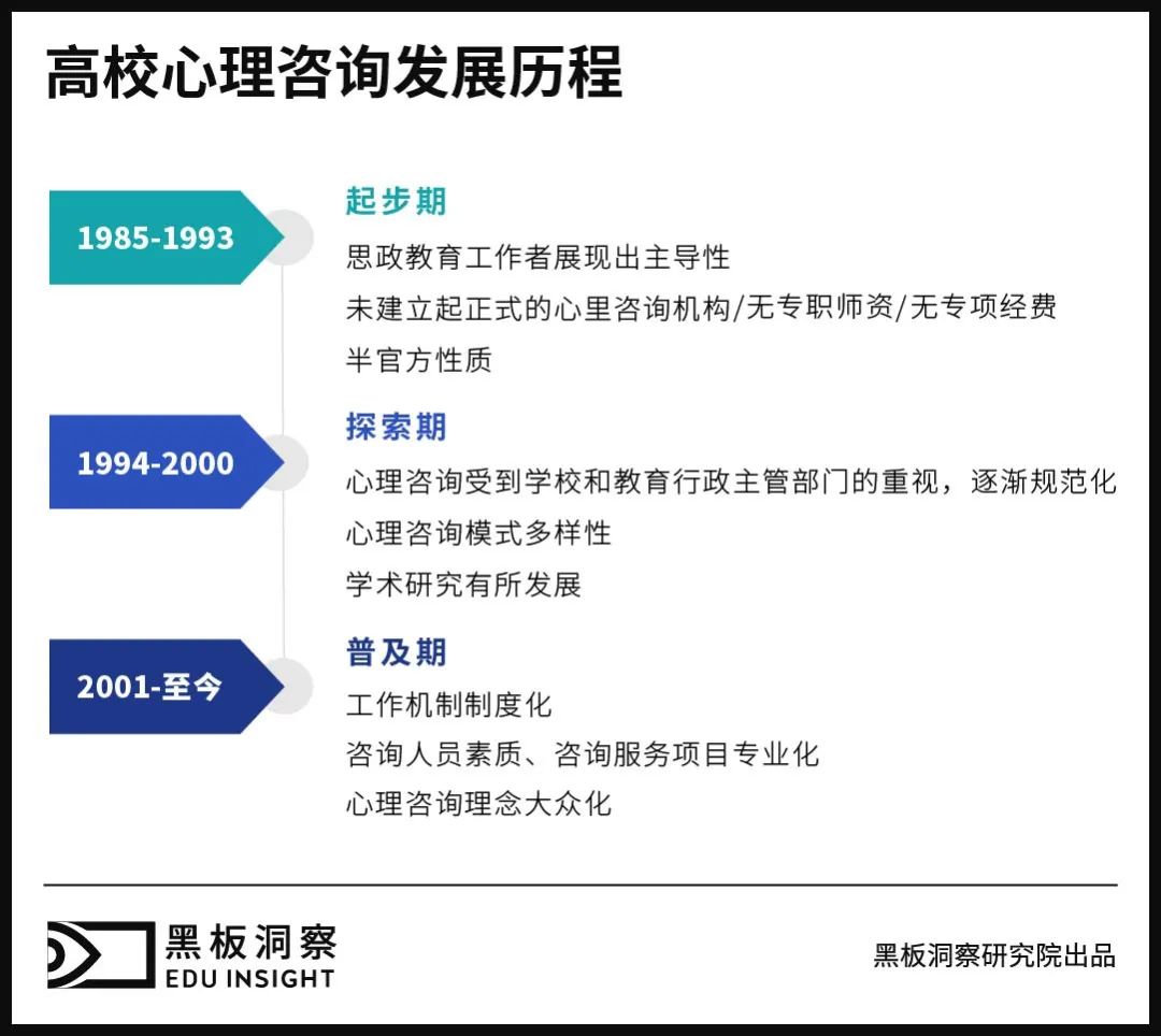 2001年,教育部发布《关于加强普通高等学校大学生心理健康教育工作的意见》,强调了加强大学生心理健康教育工作的重要性。这阶段,开始以行政化的手段在高校建立心理咨询机构和工作制度,拥有专门的经费,心理咨询师职业资格鉴定开始逐步推进。多数高校建立了心理测评建档制度、对新生进行心理普查,大部分高校建立了门诊咨询,心理咨询理念也开始大众化。