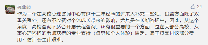 高校心理咨询发展至今,几乎每所高校都设有心理咨询中心或者心理咨询室,但实际上其所发挥的效用仍十分有限。这种有限,首先是体现在心理咨询师的数量与质量上。联合国要求学校配备专职心理咨询师的比例在1:500,在我国这个比例缩水至1:4000,而这还是文件要求的标准,现实情况可能更不乐观,有在高校任职的心理老师反映:一周要上十几节心理健康教育课,同时还要帮助前来咨询健康问题的学生,实在分身乏术。另外,高校心理咨询师晋升途径也不明确,工资与体制外的同行相比缺乏竞争力。此外,不少心理咨询老师缺乏临床经验,在面对患病学生时并不能游刃有余。2012年,一项针对上海地区高校的调查发现,70%的高校心理咨询中心被挂靠在学生处等行政部门,在我国,“一人多用”、高校心理咨询师兼职行政事务在高校十分常见。而这还是经济与教育较为发达的上海地区,其他欠发达地区可能压力更大。