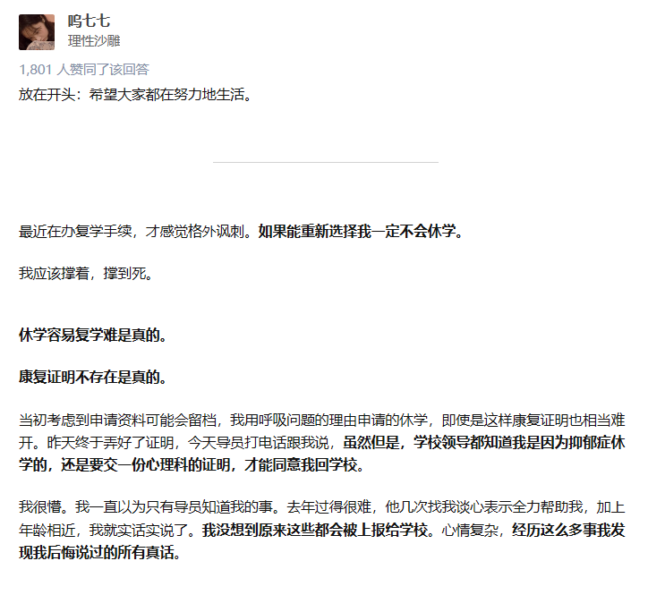 知乎问题“那些因抑郁症而休学的学生,后来怎么样了?”浏览量超过161万,以下是答主呜七七的回答。