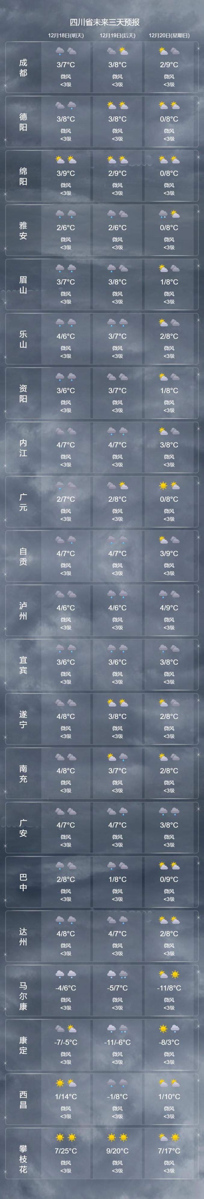 24小时内,盆地最低气温:3~5℃;最高气温:7~9℃。