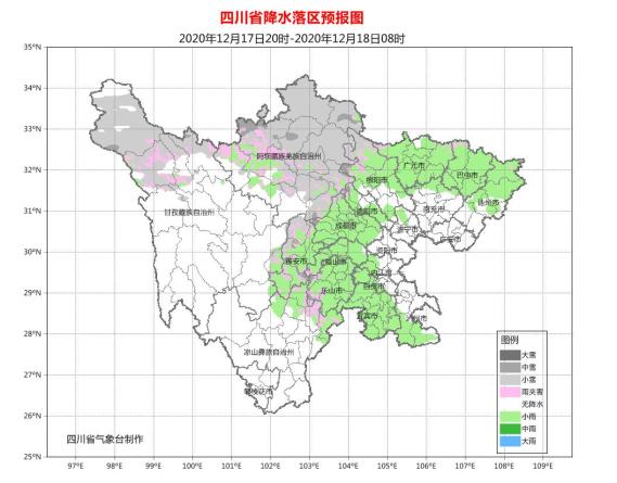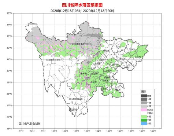 今天晚上:盆地大部阴天有小雨或零星小雨,盆周山区有雨夹雪或小雪;阿坝州大部和甘孜州北部阴天间多云有阵雪(雨),局部有中雪,甘孜州南部多云间晴;攀西地区多云间晴,其中凉山州东北部阴天间多云有分散阵雨(雪)。
